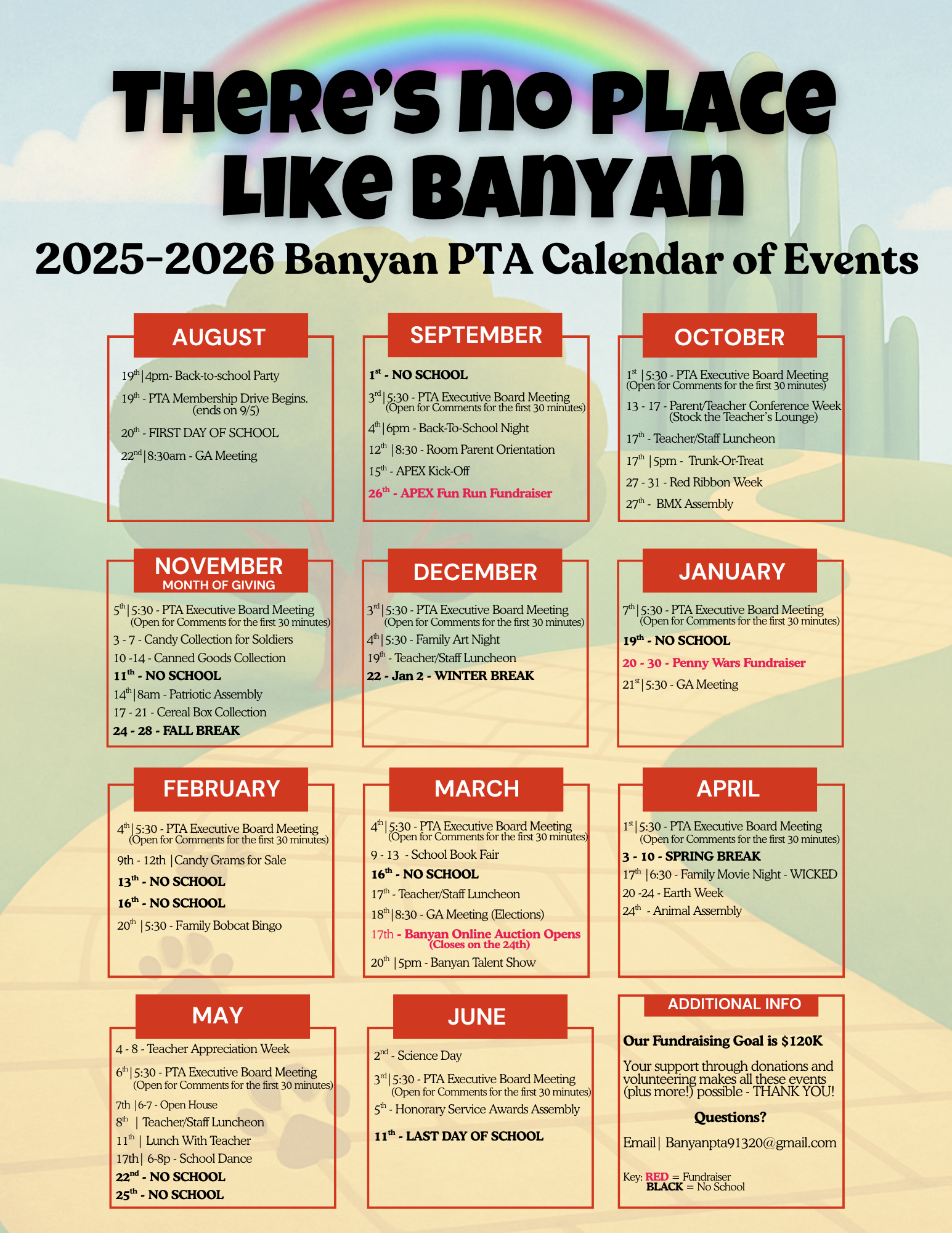 Get ready to dance the night away at our Family Dance on Friday, May 17th from 6:00–8:00 PM in the MPR! This year’s theme is Emerald City Family Dance, celebrating our school-wide theme: There’s No Place Like Banyan. Enjoy a fun-filled evening with a live DJ spinning great music for all ages. Come dressed to match the Emerald City vibe or just bring your dancing shoes and school spirit! Pizza and desserts will be available for purchase, so come hungry and ready to have a great time with our Banyan community. We can’t wait to see you there for a magical night of music, dancing, and connection! CLICK HERE TO RSVP WHICH HELPS US PREPARE FOR THIS EVENT